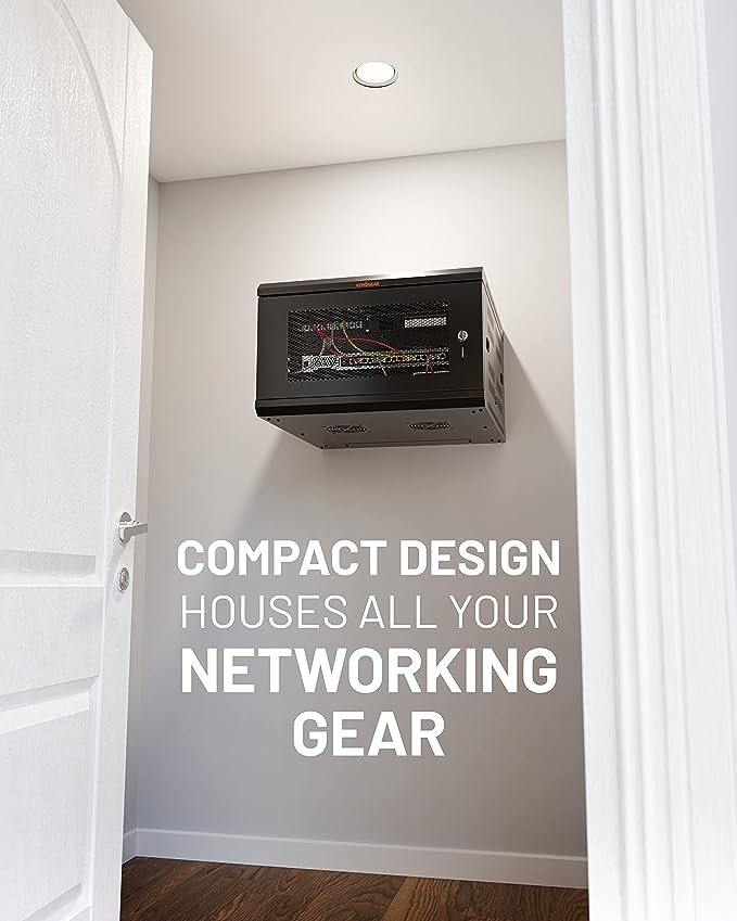 • Let's talk about specs. Coming in at 23.6" x 23.6" x 14"6, this compact rack has room for 6U of gear. That makes it easy to conceal in the back closet, but it can still hold a lot of stuff. Bring on the security system, DVR, networking equipment, and more!