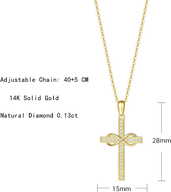 FANCIME 14k Solid Yellow Gold 0.13cttw Diamond Crucifix Cross Infinity Forever Love Pendant Necklace Fine Jewelry Birthday Mother's Day Gifts for Women Girls, 16"+2" Extender