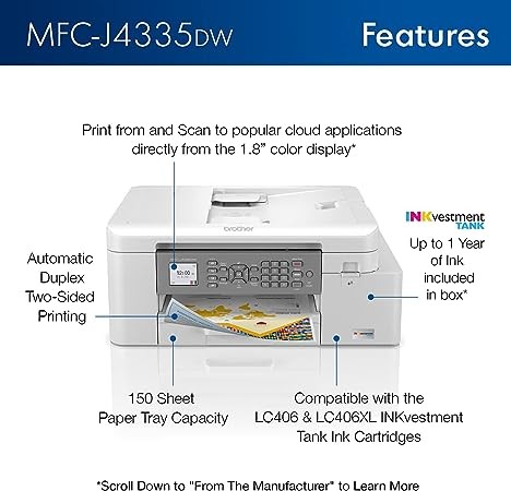 Large page yields means less ink replacement. When you do need to replace your ink supply, choose Brother Genuine LC406 Standard or High-Yield INKvestment Tank replacement cartridges for even more convenience. To avoid worrying about running out of ink again, get started with Refresh EZ Print Subscription service and save up to 50% on ink(1).