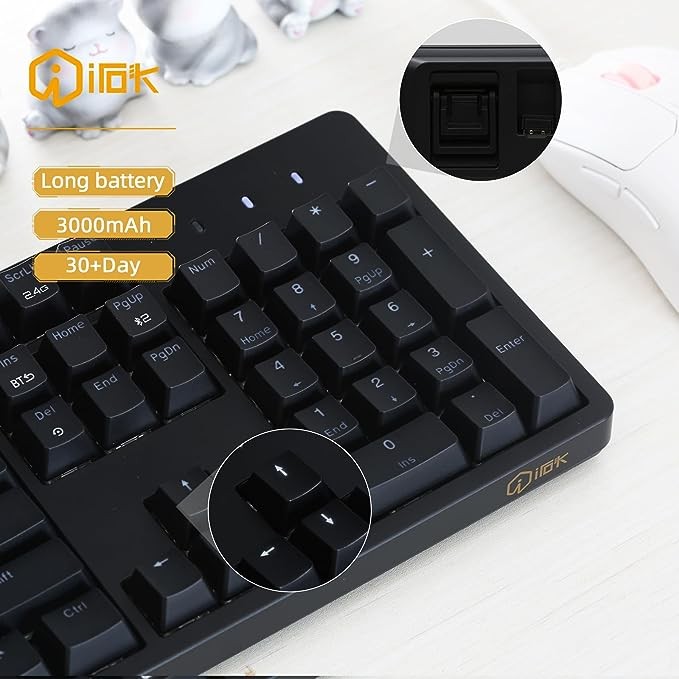 • 【High-performance 2.4G Wireless Keyboard】 Up to 10m wireless working distance, enables the keyboard to achieve long-range wireless control. The receiver on the back of the keyboard. Play and plug, conveniently designed for gaming or office or home use. Two working modes, wired (Type C cable) and wireless, enjoy the freedom of being wireless while still not compromising performance by going wired