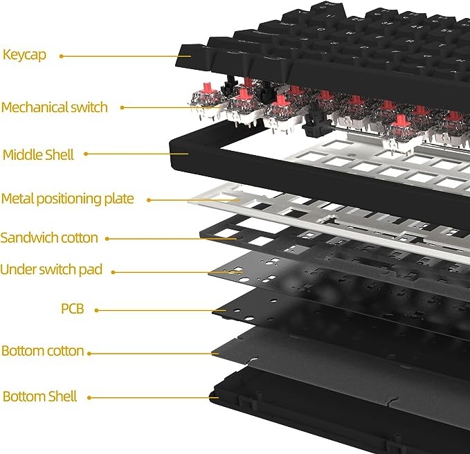 • 【Triple layer sound deadening structure】IROK mechanical keyboard uses under switch pad, sandwich cotton and bottom cotton design to minimize the noise, making every strike achieve the best feel and sound. Top sound-deadening silicone pads absorb the impact of every keystroke to create flexible, soft and clean typing