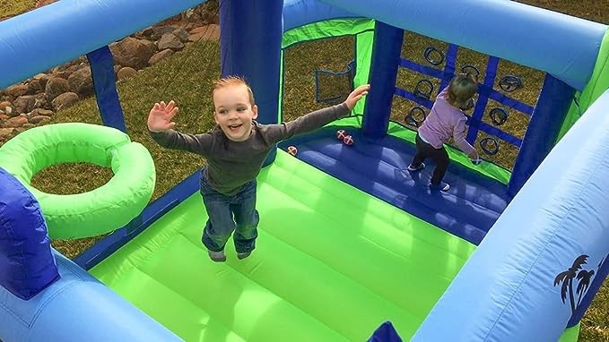 Island Hopper Shady Playhouse with Shaded Canopy - Recreational Children's Bounce House with Padded Floor Side Room, Basketball, Target Throw, tic-tac-toe