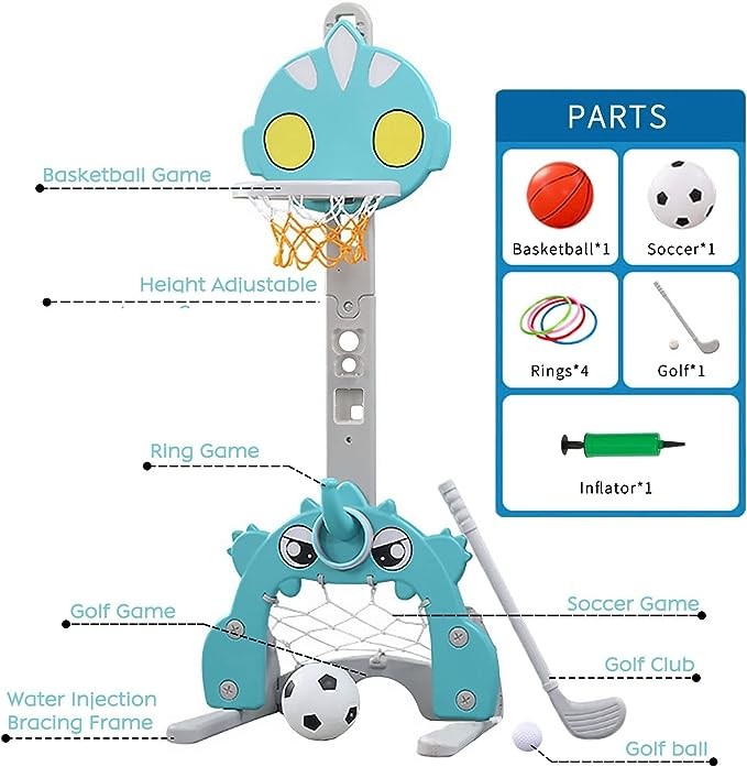Kids Basketball Rim Set 4 in 1 Sports Activity Center Easy Score Soccer Goal Ring Height Adjustable